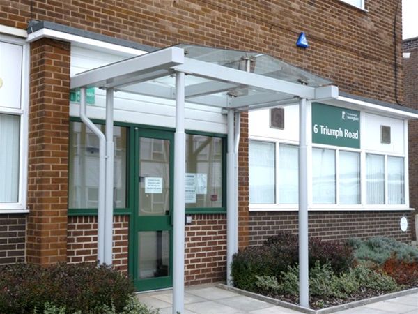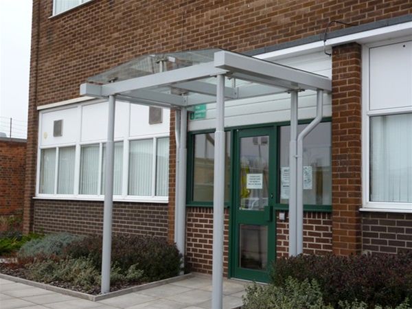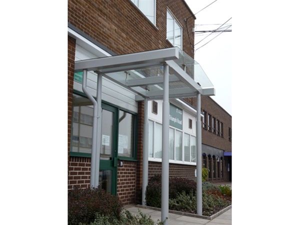 An economical attractive Apex roof style glazed canopy, comprising of a fully decorated mild steel free standing framework with legs taken down to concrete foundations below ground level. Glazing to the canopy roof area was provided by using clear toughened safety glass panels securely fixed using our bespoke planar type fixing arrangement, complete with integral ridge flashing. A gutter channel and downpipe at each die of the glazed canopy unit provided drainage from the roof area. All steelwork was decorated in a heavy duty exterior grade high gloss enamel paint system giving a long lasting finish to the glazed entrance canopy feature.