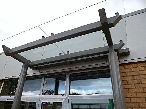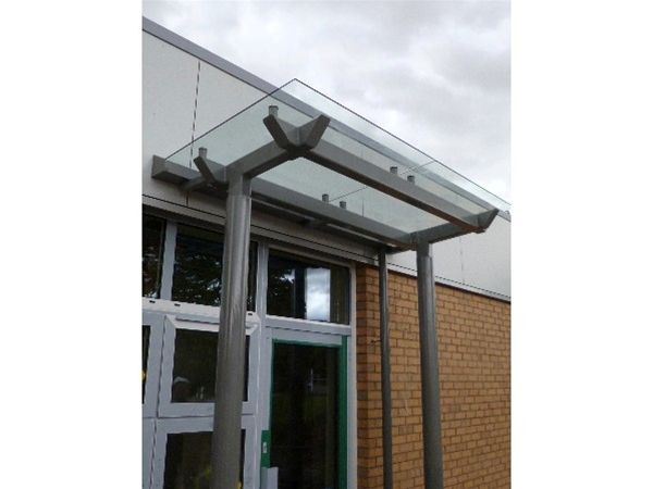 Comprising of a fully decorated mild steel framework complete with two CHS support columns taken down to concrete foundations below ground level. All steel work was fully decorated using our standard heavy duty exterior grade enamel paint system, which is available in any standard BS or RAL colour. Roof covering was provided by the use of clear toughened safety glass panels fixed in a stainless steel planar type system. An integral aluminium gutter channel and down pipe completed the design.