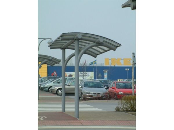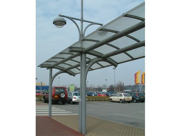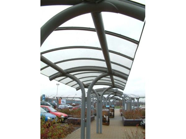 Urban Design offers a vast array of walkway options in a wide variety of materials. This example is of a decorated mild steel framework, barrel vault style with a solid cold formed, clear polycarbonate roof covering fixed using aluminium glazing straps. A variety of shapes and configurations were used on the retail park to provide pedestrian cover between different shops and car park areas. Support legs are taken to concrete foundations below ground level and all steelwork is decorated using our standard heavy duty exterior grade enamel paint system.