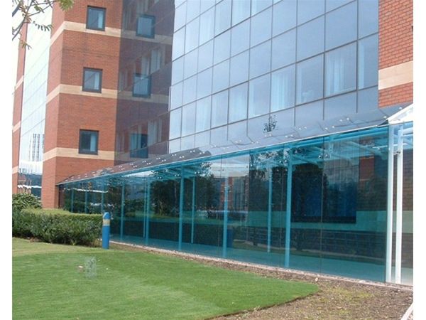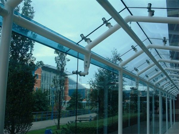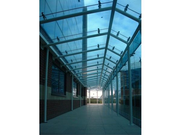 The enclosed walkway provided an economical solution to connecting various buildings on the office development. The walkway was fabricated entirely from heavy duty CHS members. Support legs are taken down to concrete foundation bases below ground level and horizontal bracing were fixed back to the main structure. Glazing to the vertical walls and roof area is by the use of ‘anti sun blue’ toughened safety glass panels supported by stainless steel planar type fixings throughout. All steel work is decorated using our standard heavy duty exterior grade enamel paint system. A rear integral gutter system completed the design.